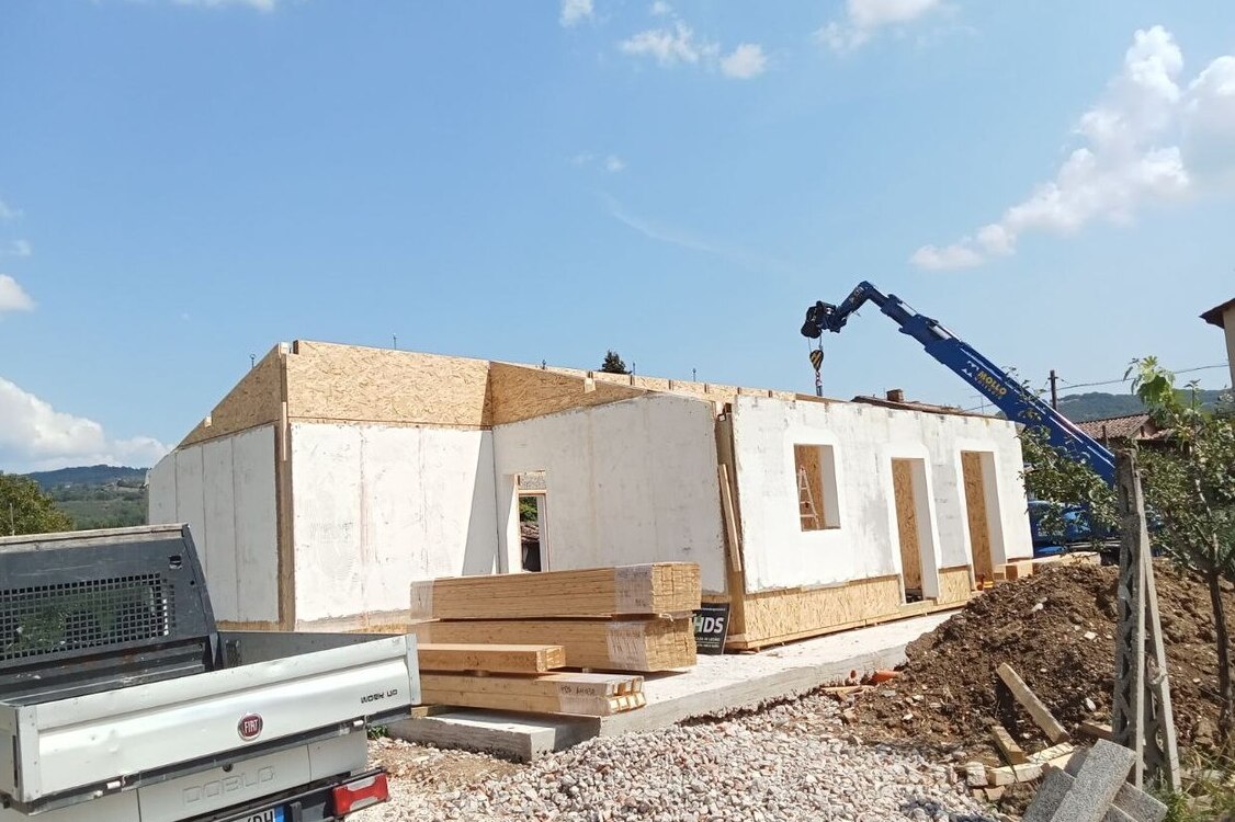 1) Clicca i simboli colorati sulla mappa per vedere le foto e la scheda tecnica di ciascun progetto di edilizia in legno; con il selettore puoi filtrare i progetti in base allo stato di avanzamento (in progettazione / in corso / terminati).